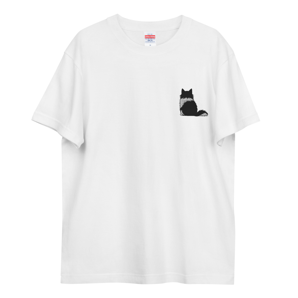 小さな猫モチーフを胸元に刺繍した、静かな存在感のTシャツ。